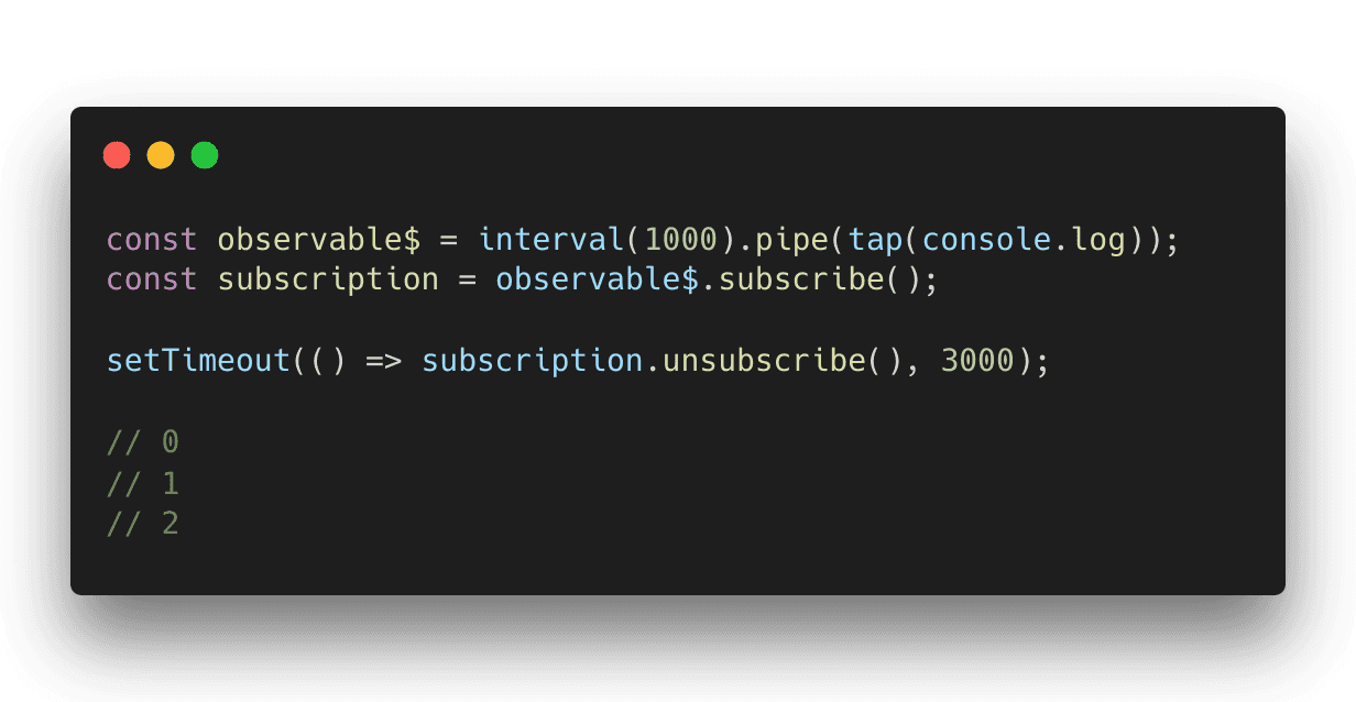 As we usually do with standard functions like removeEventListener() or clearInterval() we also need to cleanup the Observable execution to avoid memory leaks.